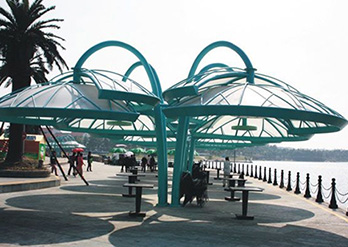 膜結(jié)構(gòu)景觀涼亭具有高抗張拉強(qiáng)度,高抗撕裂強(qiáng)度,材料尺寸的穩(wěn)定性,即對伸長率的要求,抗彎折性,要有一定的柔軟度,要有較高的透明度和放射太陽光的能力
