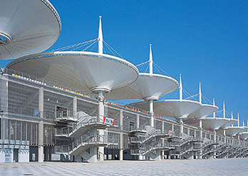 膜結(jié)構(gòu)主席臺(tái)改善了早期鋼筋混凝土結(jié)構(gòu)給人帶來的單一笨重的感覺,配合著鋁塑板造型的多樣化也慢慢映入人們眼簾